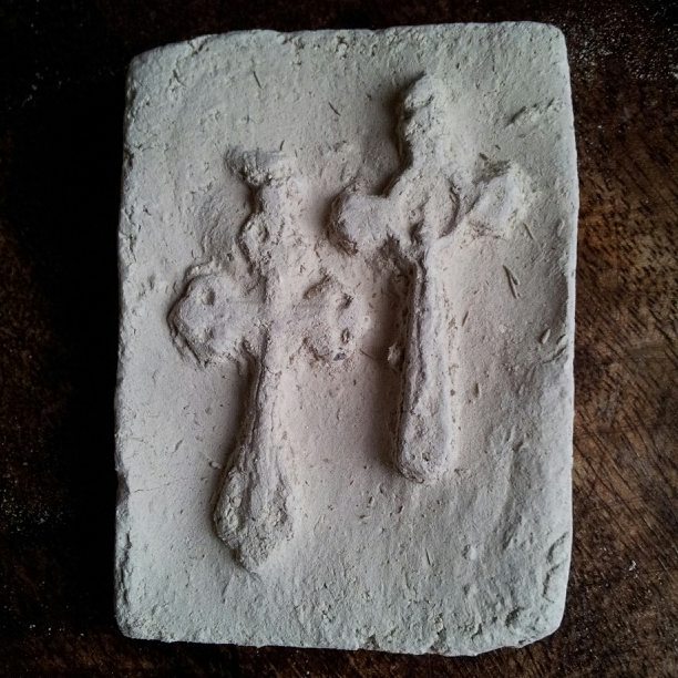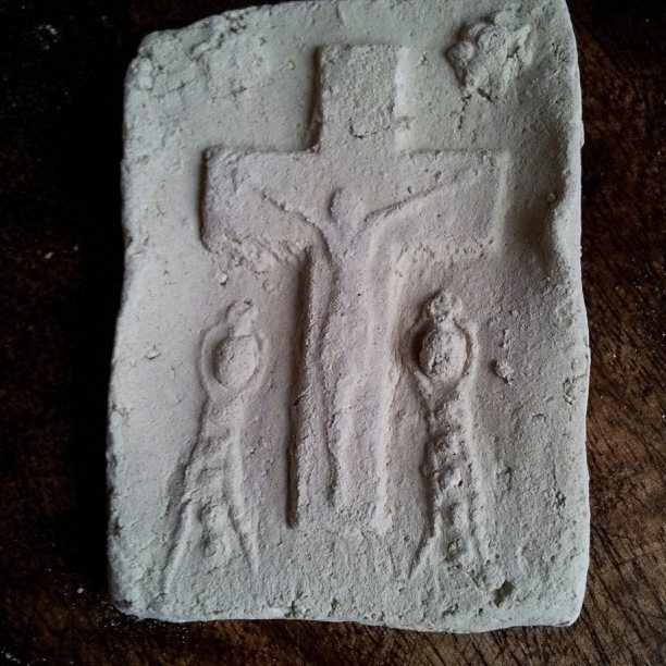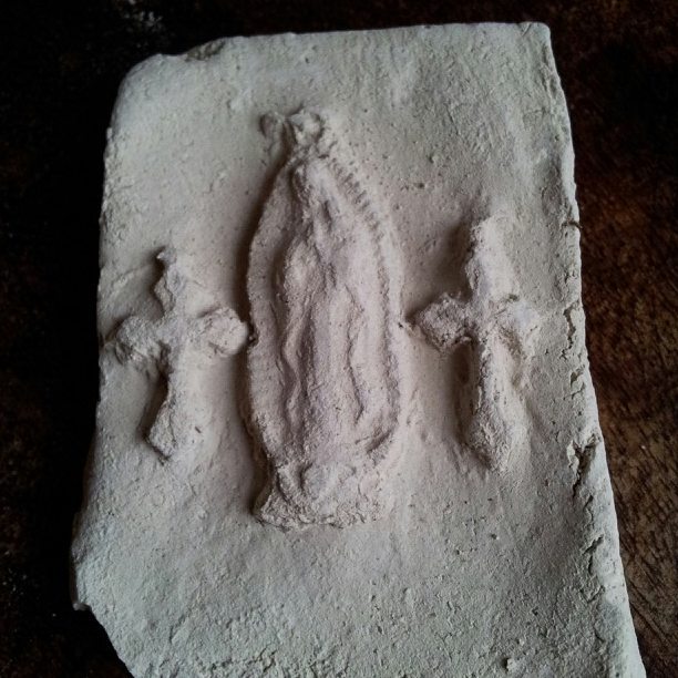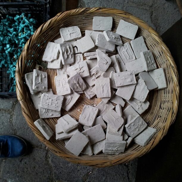 Soil for oral use in Guatemala, known as ‘pan de dios’, i.e. 'bread of god’. The earth tablets are stampted with the images, often of cross. The soil comes from the pilgrimage town of Esquipulas, and according to the vendors is blessed.